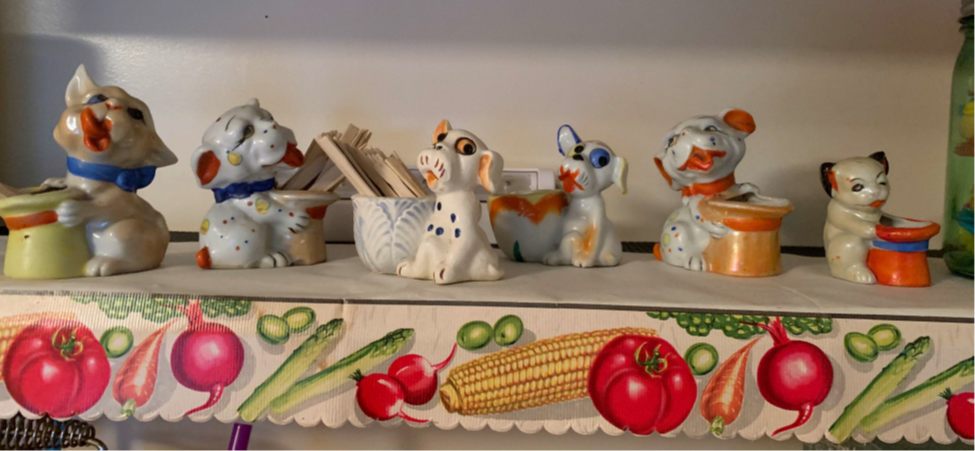 One of my first online purchases was a ceramic dog holding an upside-down top hat. It was to hold toothpicks. My husband bought me the first one. Little did he know what was to come. It had all the elements needed for my “why would someone buy this?” criteria. Ugly and weird. I go on Ebay for my first search for a vintage ceramic dog with top hat (you always add vintage to your search) and I was stunned. Who would have thought this was a thing in the 50s and 60s. I almost had a coronary when I saw so many to choose from. I feel sorry for the far-right one in this picture but it is also my favorite. It’s the ugliest, weirdest and the creepiest. It looks like they bred a dog with a clown.