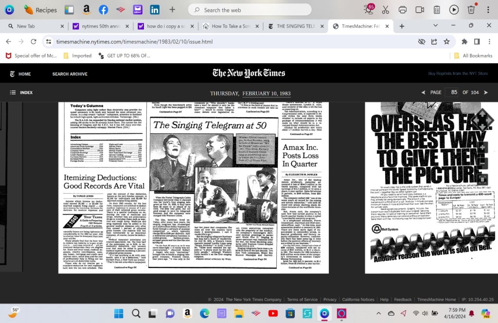 That’s me on the front page of the New York Times business section. In the 80’s I travelled all the NY boroughs (using public transit) with a mechanical monkey, kazoo, whoopee whistle and tambourine. By the time I ended my telegram career I had travelled on every subway line from one end to the other. The two worst trips were Coney Island and Staten Island.
